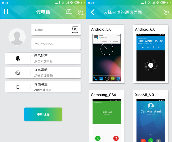 安卓上可以虚拟来电的APP有很多,它们基本大同小异,这里以这款“假电话”为例。假电话APP的使用很简单,开启后,可以填写虚拟来电的各种信息,包括来电人的头像、名字和电话号码等等。而根据你的手机ROM不同,还可以设置不同的界面。这款假电话APP提供了原生安卓5.0、6.0以及三星、MIUI的拨号界面用于模拟,如果你用的是这些机型,那么更加能以假乱真。