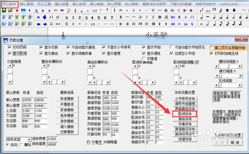 1.输入歌词前,要做些准备工作。首先是确定歌词字体字号。单击开心创作---页面设置。单击歌词字体选项。