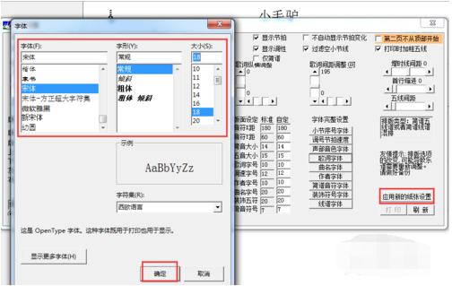 2.接着选择字体字号,比如说,宋体,18磅,单击确定。字体美观大方就行了,字号不宜太小,太小了看不清楚,也不宜太大,太大了容易重叠,不好排版。然后单击应用新的纸张设置。