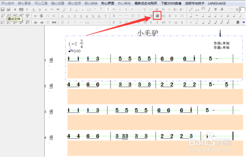 5.输完以后,单击“词”按钮退出编辑状态。现在作品的谱和词都做好了,就要开始准备输出作品了。