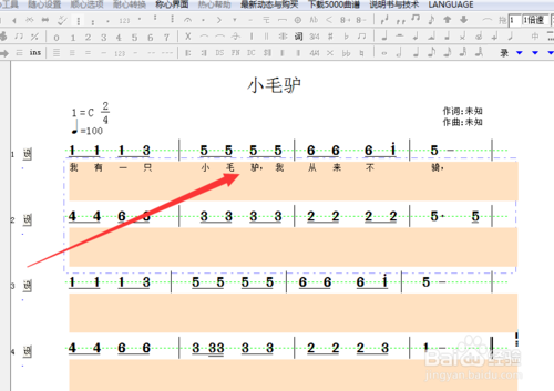 4.输入歌词,最好输入一小节内容,马上把文字和音符对齐。有两段以上,按回车键就可以输入第二段。一行一行的输入,一行一行的对齐,直到结束。方法和word差不多。