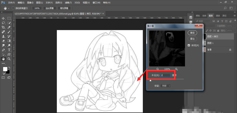 在最小值面板中,设置半径大小为1、2像素,画布中会显示效果,点击面板中的确定,