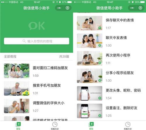 刚用微信的长辈应该对微信还是一知半解的,可以使用【微信使用小助手】小程序,它专门把微信中的一些常用操作制作成了视频教程,长辈需要用到哪些功能,直接在小程序里面搜索就能找到。