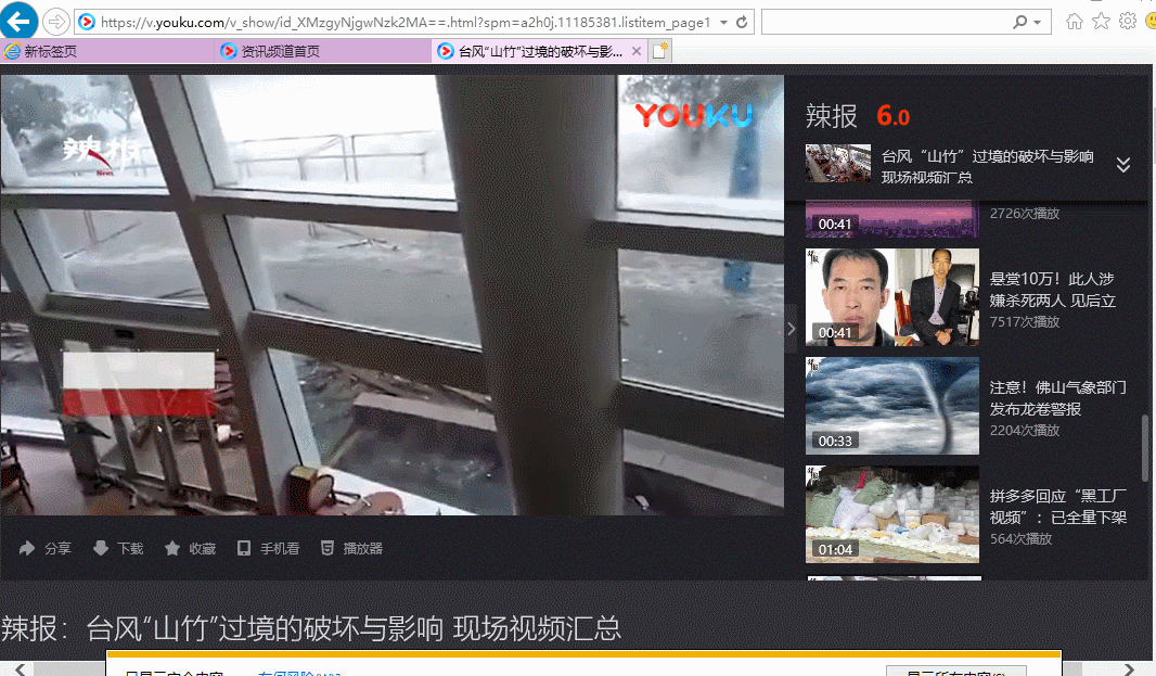 首先打开IE浏览器,搜索一个视频网站,以优酷为例,点击播放一个你喜欢的视频,