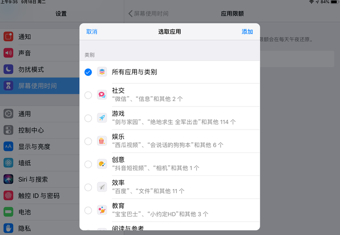需要注意的是,这个是对一整类APP进行统一计时且强制执行的,比如设定游戏类APP限额一个小时,你玩了王者荣耀1小时,到了1小时就自动强制锁定(不管你是不是在开排位),而且所有被纳入游戏类的APP全部也遭到锁定。