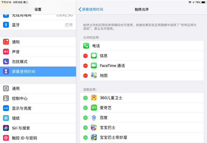 有的APP无需进行使用时间管理,怎么办呢?“屏幕使用时间”为用户准备了白名单功能,用户可以将无需进行时间管理的APP添加到“始终允许”中去,在这里可以单独的将某个APP添加进来。