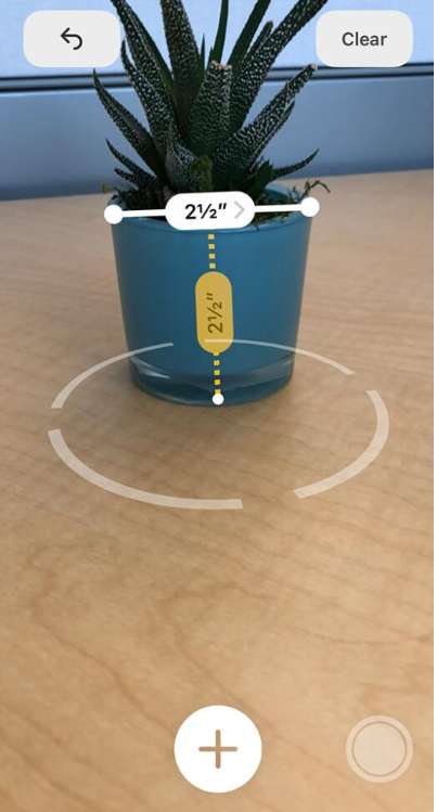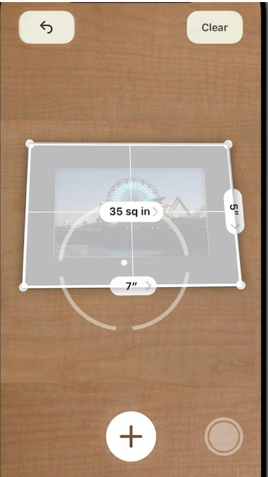 当设备检测到您要测量的物体是正方形或长方形,它会自动在物体周围放置一个测量框。轻点 +会显示物体的宽度和长度的测量结果。轻轻移动设备,将显示计算出的物体面积。