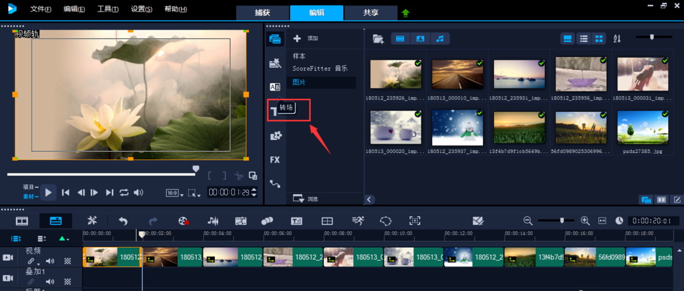 打开会声会影软件,将准备好的图片导入到软件,选中需要的图片直接拖拽到下面的轨道中,