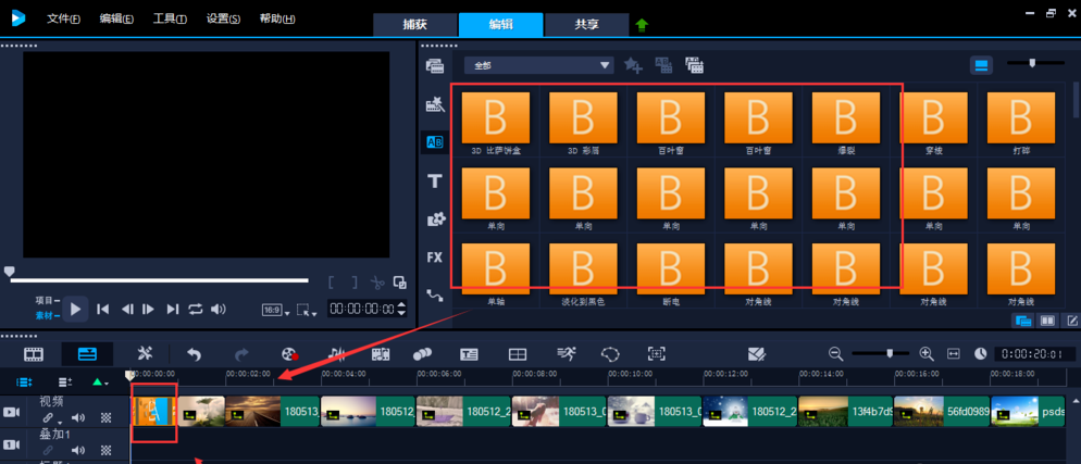 选择合适的转场,直接选中拖拽到该图片位置即可,如下图所示,