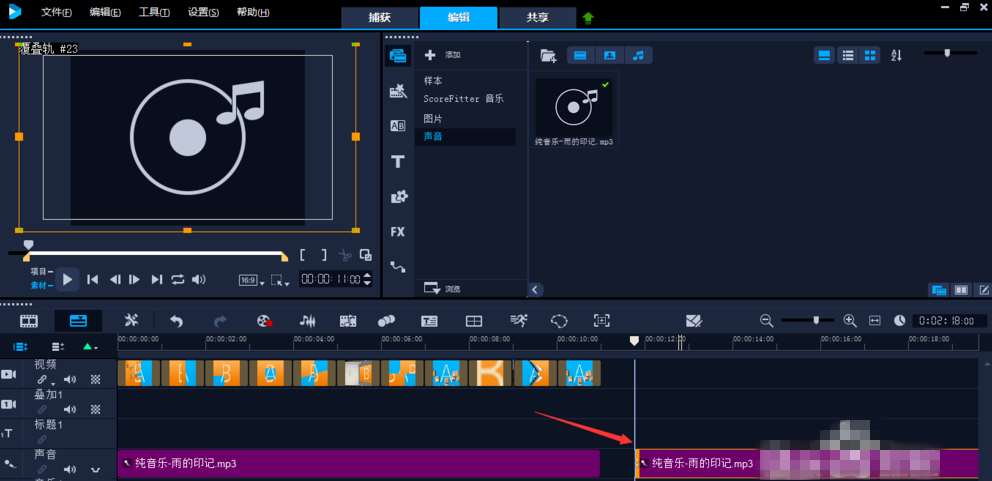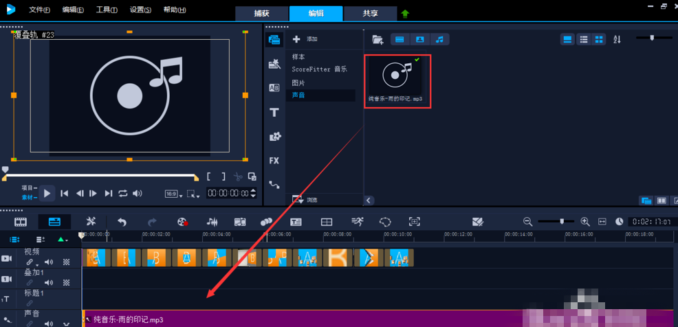 转场添加完成,再添加音乐背景,将音乐拖拽入音频轨道,