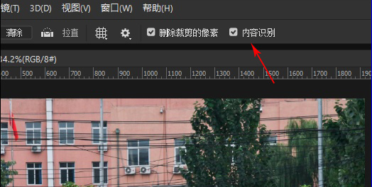 PS CC 2018为我们提供了一项非常简单的方法,即在裁剪时,勾选工具栏最右侧的“内容识别”,这时再来旋转一下,你会发现图片白边神奇地不见了!