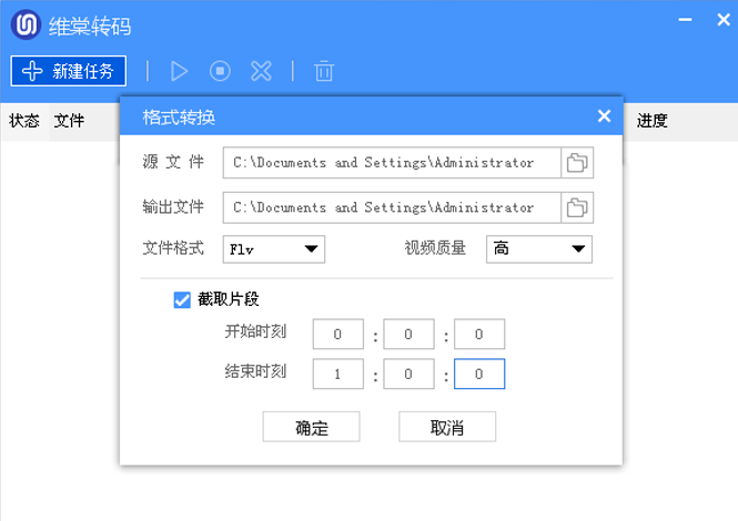 勾选截取片段选项,设置开始时间和结束时间,这里截取片段为1分钟。点击确定,进入自动转换阶段,进度显示100%,代表完成截取转码操作。