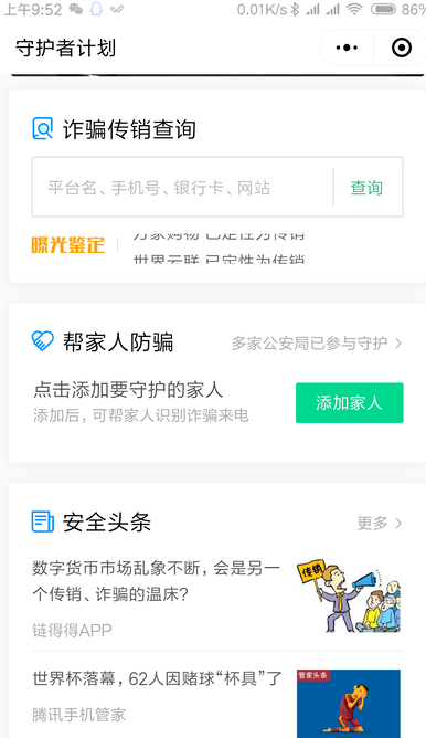 “守护者计划”小程序的使用比较的简单,它主要的功能有几个:一是诈骗传销查询,一是帮家人防骗,还有就是相关的一些辟谣及安全信息。你可以通过扫一扫功能进入“守护者计划”小程序,也可以在微信→发现→小程序→右上角搜索→输入“守护者计划”进行搜索使用。