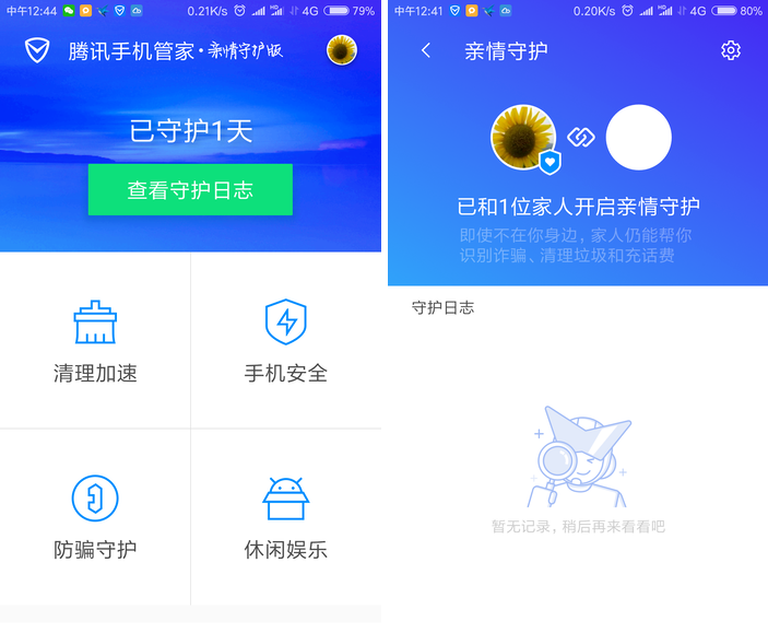 图6 手机管家亲情守护版主界面 图7 成功建立守护
