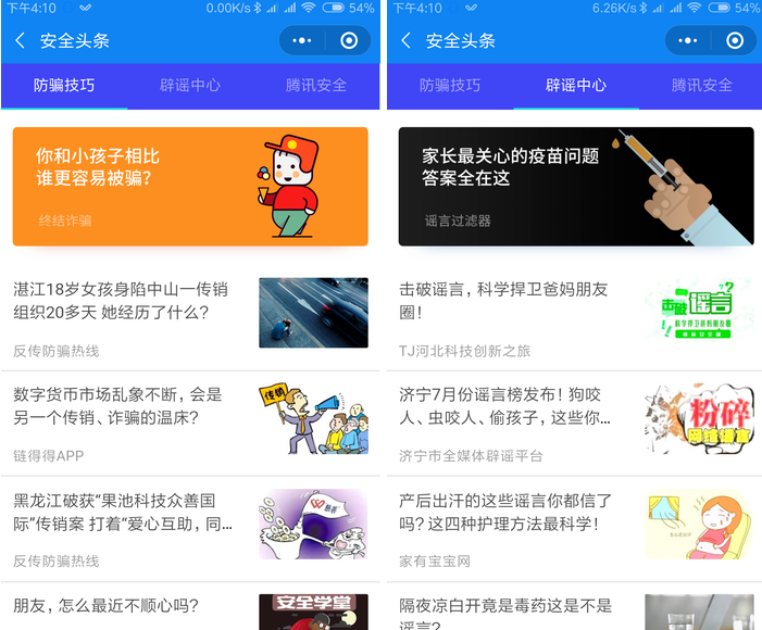 “守护者计划”小程序中还有较为实用的“安全头条”,包含了防骗技巧、辟谣中心以及腾讯安全,相关的文章可以发给家人看看,多看多长心眼。