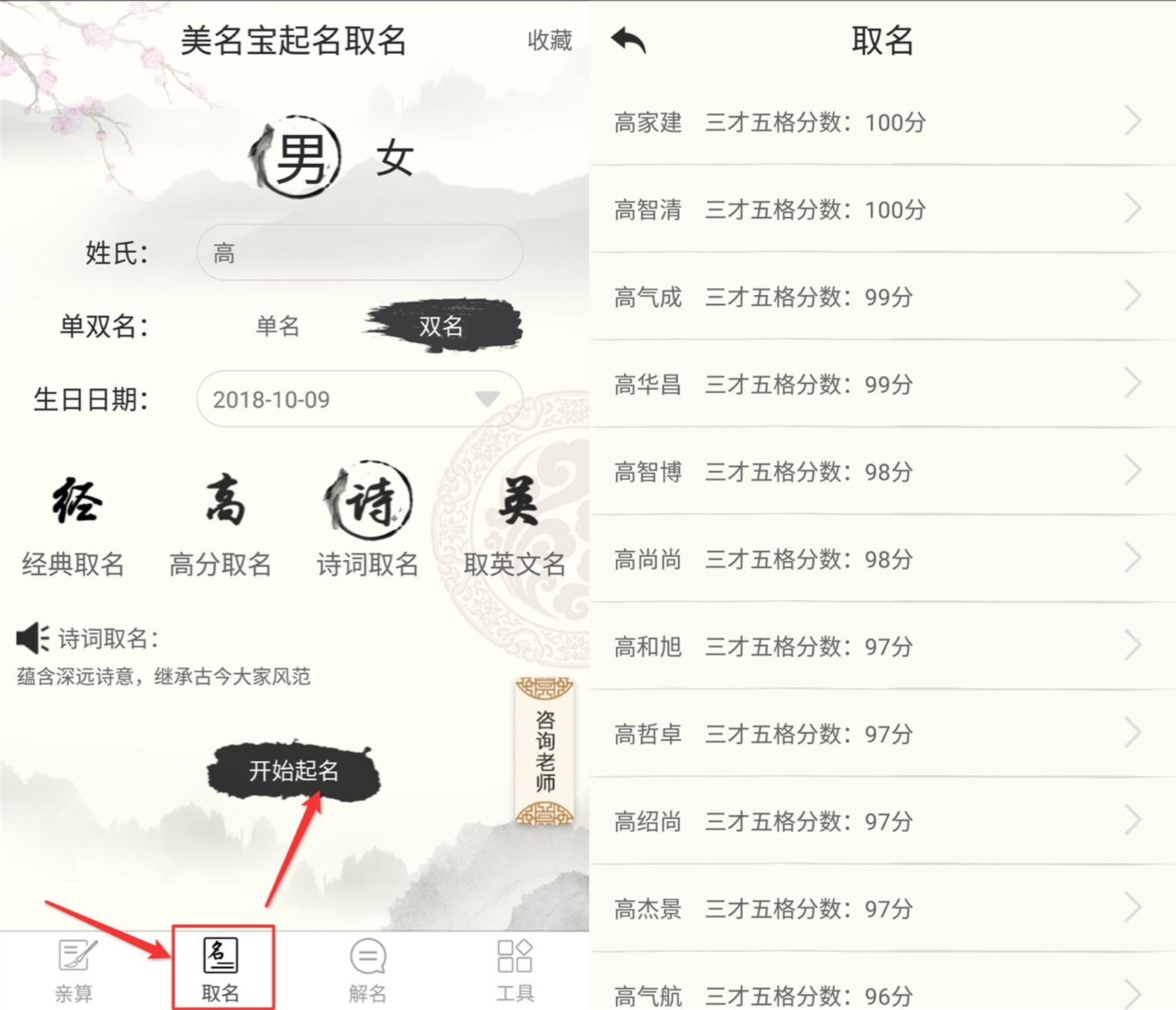 取名步骤:打开【宝宝起名取名专家】-选择【取名】-选择【男/女宝宝】-输入【姓氏】-选择【单/双名】-输入【生日日期】-选择【取名方式】(包括经典取名、高分取名、诗词取名、取英文名等多种方式)-点击【开始起名】