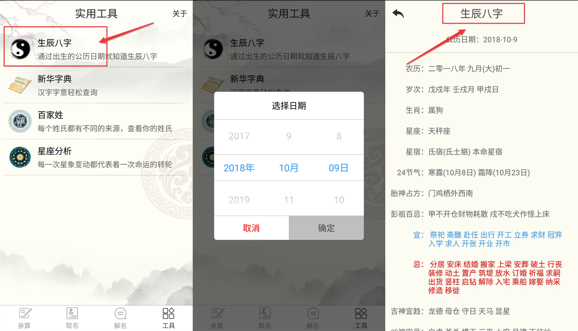 分析步骤:打开【宝宝起名取名专家】-选择【工具】-选择【生辰八字】-选择宝宝【生日日期】-点击【确定】得到八字分析