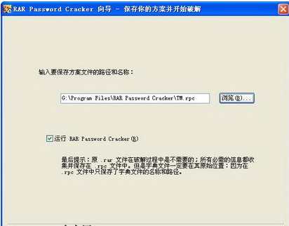 在打开的“保存你的方案并开始破解”向导页中,单击“浏览”按钮设置方案的保存位置和名称。保持“运行RAR Password Cracker”复选框的选中状态,并单击“完成”按钮。