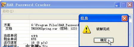RAR Password Cracker开始尝试恢复RAR压缩文件的密码。成功恢复后会打开“信息”对话框,单击“确定”按钮即可。