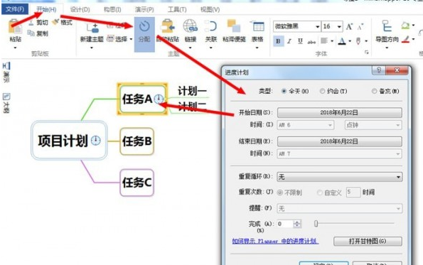 3.选中主题框,在开始菜单栏中找到【分配】,我们可以在弹出的进度计划弹窗内编辑任务信息,包括开始日期、结束日期、重复循环、完成度等等。