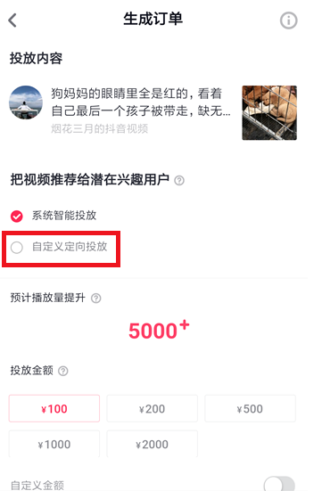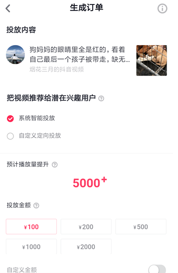 接着进入生成订单界面,这里默认的是系统智能投放,目前来说,一百块钱可以获得5000左右的播放量提升。