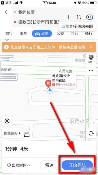 进入到了导航模式,还有对应的语音播报,实际上微信并没有导航功能,是连击三方软件完成导航的。