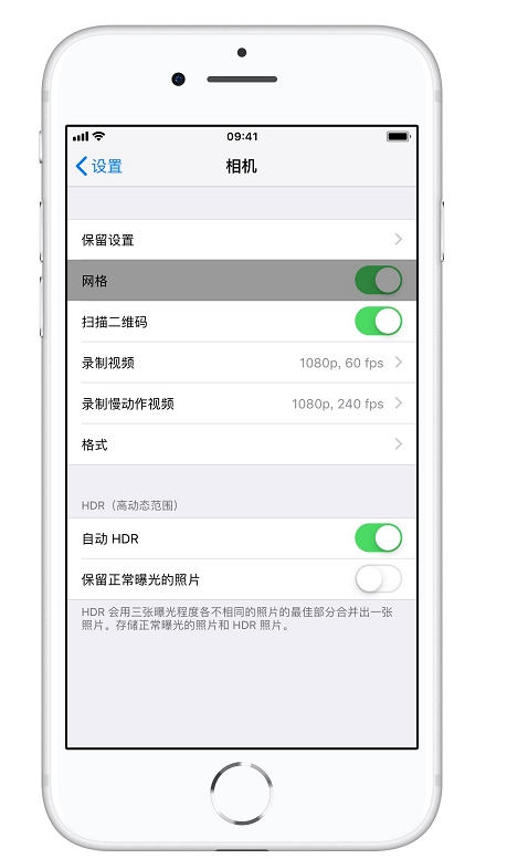 前往「设置」-「相机」,即可开启「网格」,使用「网格」拍照时,构图更加方便清晰。