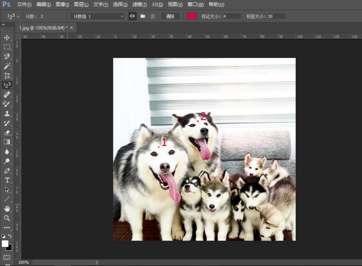 打开Photoshop软件,导入素材图片,如下图,我们需要计算大狗和小狗的数量。
