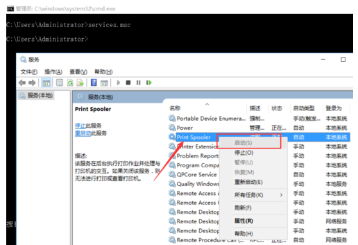 打开服务界面,找到与打印机相关的服务“Print Spooler”,如果此服务没有正常开启,右击此服务项选择“开启”即可。