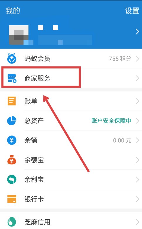 打开手机支付宝,进入我的界面,点击“商家服务”,或者直接在首页搜索商家服务,