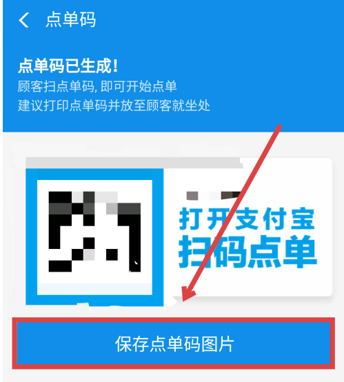 商品添加完成,点击确认按钮,支付宝就会给这个商品生成一个“点单码”,保存点单码进行打印,粘贴到客户可以点单的地方。