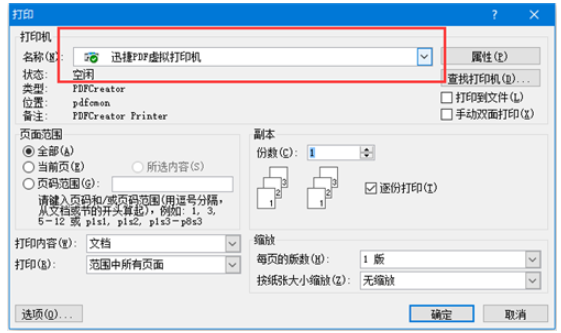 4、任意打开一个office文档,点击进入“打印”设置窗口,就可以在“打印机”选项中找到迅捷PDF虚拟打印机。开始打印操作,输出的不是纸质文档、而是PDF格式文件。