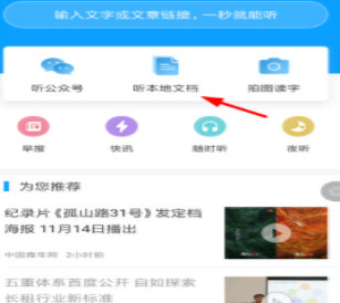1、简单来说,想把本地文档导入到讯飞有声里,大家需要从首页的上方点击“听本地文档”按钮,这样就能找到本地文档进行朗读。