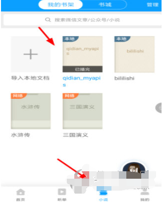 3、另外打开软件的小说分类之后,就可以在我的书架里找到自己刚刚导入朗读的本地文档了,从中还能直接搜索微信文章或小说哦!