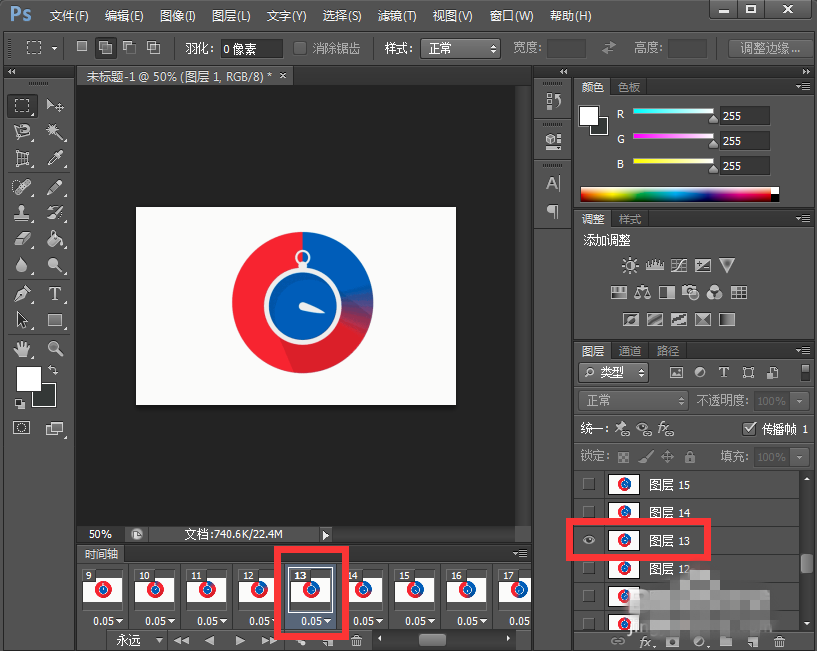 然后在页面下方会出现时间轴,里面有每一个图层对应的时间,可以点击播放进行预览。