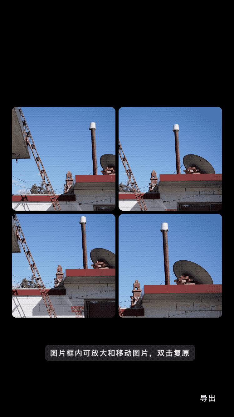 最后一个模式则是拼图,你可以把四张不同的构图拼成一张,在图片框内也能随意进行放大和移动,双击可以复原。