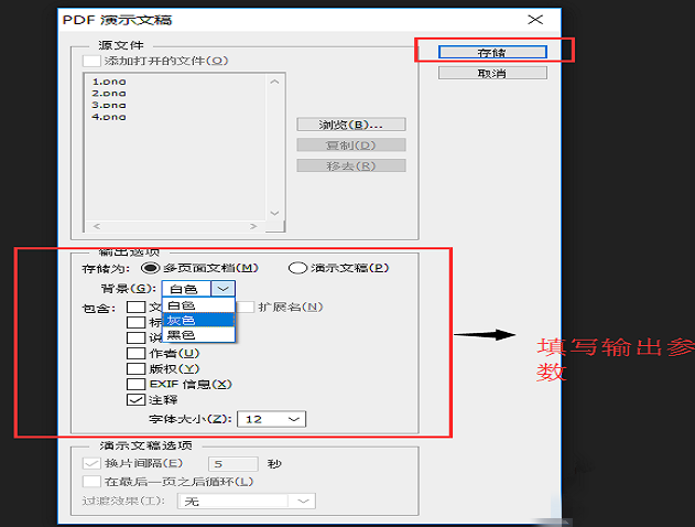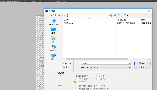 打开Photoshop软件,然后打开4个PDF文档,点击存储为,选择PNG格式,将这4个PDF文档转化为图片格式,