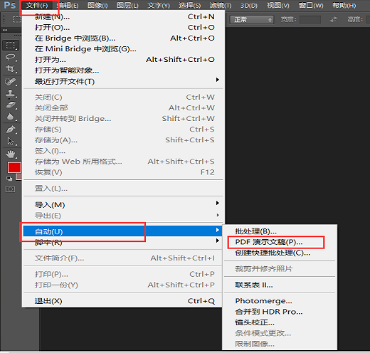 点击PS菜单栏中的文件——自动——PDF演示文稿,如图,