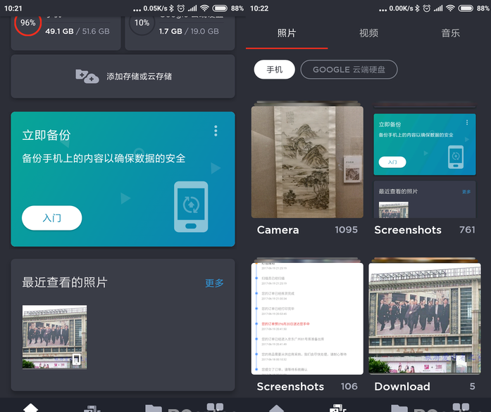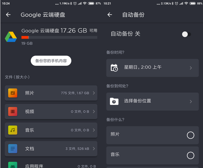 连接了Google Drive这样的云存储服务,除了可以查看当中的内容外,还能够用来备份本地文件。在云存储的界面,很轻松就可以找到备份手机内容的按钮,接着能够选择照片、视频、音乐等文件类型进而备份。而通过设置自动备份,还能够让存储地带APP定时备份特定位置的文件,但是不能实时备份以及不支持国内常见的百度云服务这些点,还是令其实用性打了一些折扣。