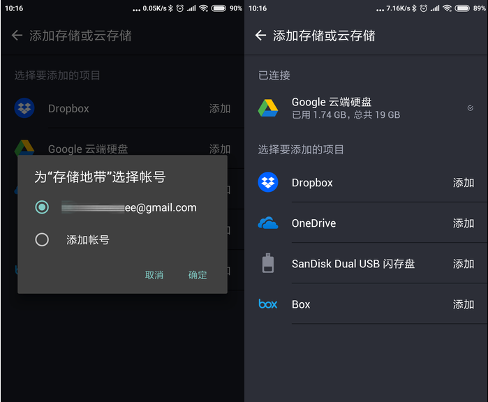 存储地带APP的云存储功能和备份功能是尤为值得一说的。它支持国际主流的云存储服务,例如Dropbox、Google Drive、OneDrive等等,甚至还能够连接闪迪的U盘作为额外存储,但连接U盘的话需要OTG。这里以连接Google Drive为例,如果你设备有Google框架并已经登录,那么存储地带APP就可以自动关联你的Google账号,连接Google Drive作为额外的存储空间使用。