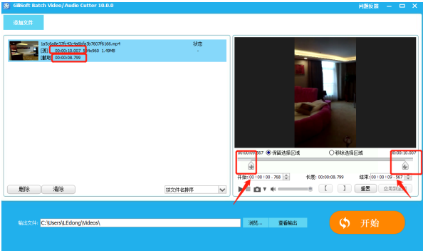 视频时长是十秒,在右侧面板中拖动进度条进行截取,从左侧面板中可以看到截取了八秒时长,
