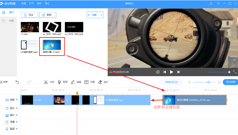 打开EV剪辑工具,将准备好的视频素材全部添加进来,