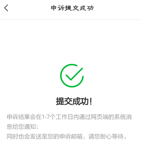 按照要求填写资料,点击提交,申诉成功、等待处理。