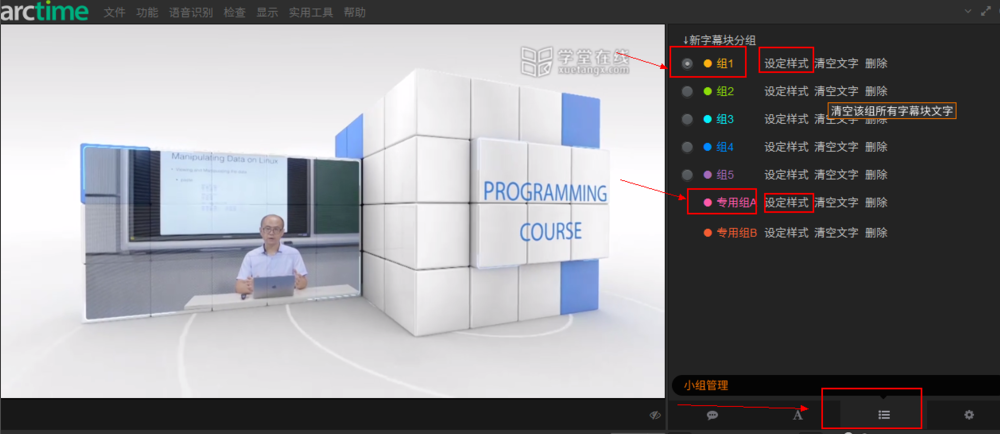 7、然后进入“小组管理”工具,组1中的设定样式为中文字幕,专用组A的设定样式为英文字幕,按crtl+s保存,再预览,