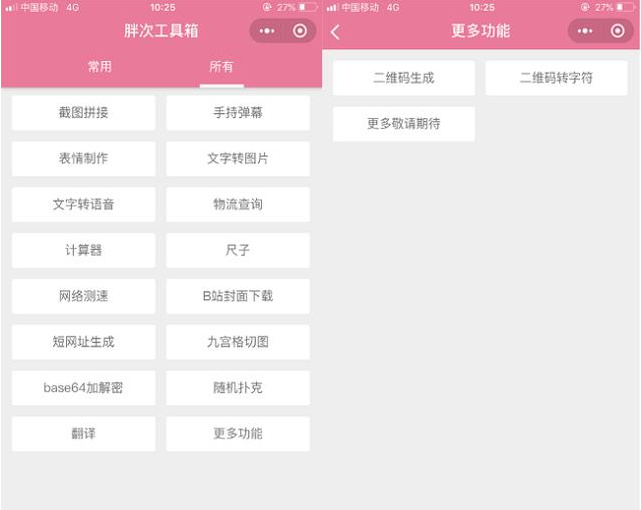 胖次工具箱是一个简洁、无广告的多功能工具箱,支持九宫格切图、计算器、物流查询、二维码生成等小功能,非常良心,这款小程序堪称万能。