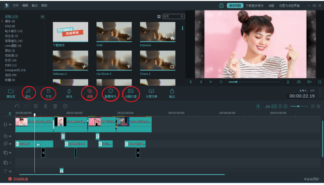 除了转场特效,点击预览窗口里别的按钮还可以对相册视频添加音乐、文字、滤镜等元素,
