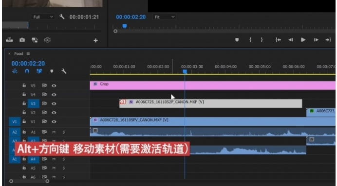 一般来说,我们都是使用鼠标移动剪辑,但是当你按下D选中对应素材、完全可以按住Alt和上下左右键移动素材位置的,需要注意的是需要激活相应的轨道才能够进行移动,如果你想用更快的速度移动素材,那你可以按住Alt+Shift+方向键来快速拖动素材。