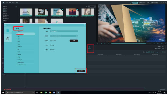 最后点击预览窗口上的输出按钮,选择MP4格式,输出视频,所有工作就完成了。