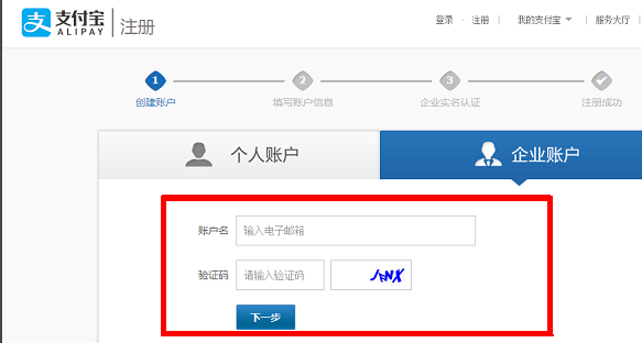 进去注册界面,选择企业账户,输入邮箱和验证码,点击下一步,
