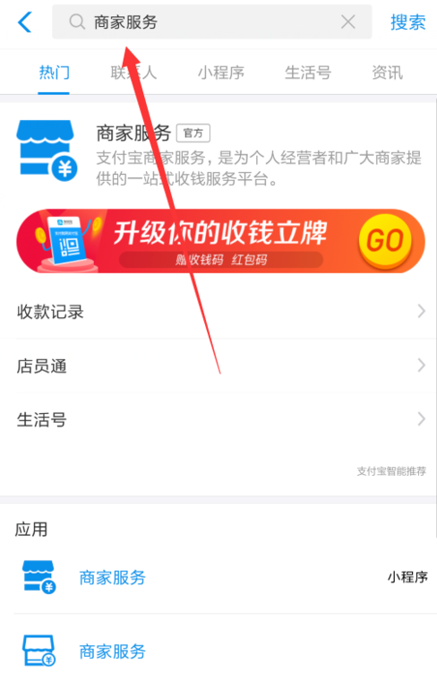 打开支付宝,进入界面,点击搜索“商家服务”,申请成为商家,